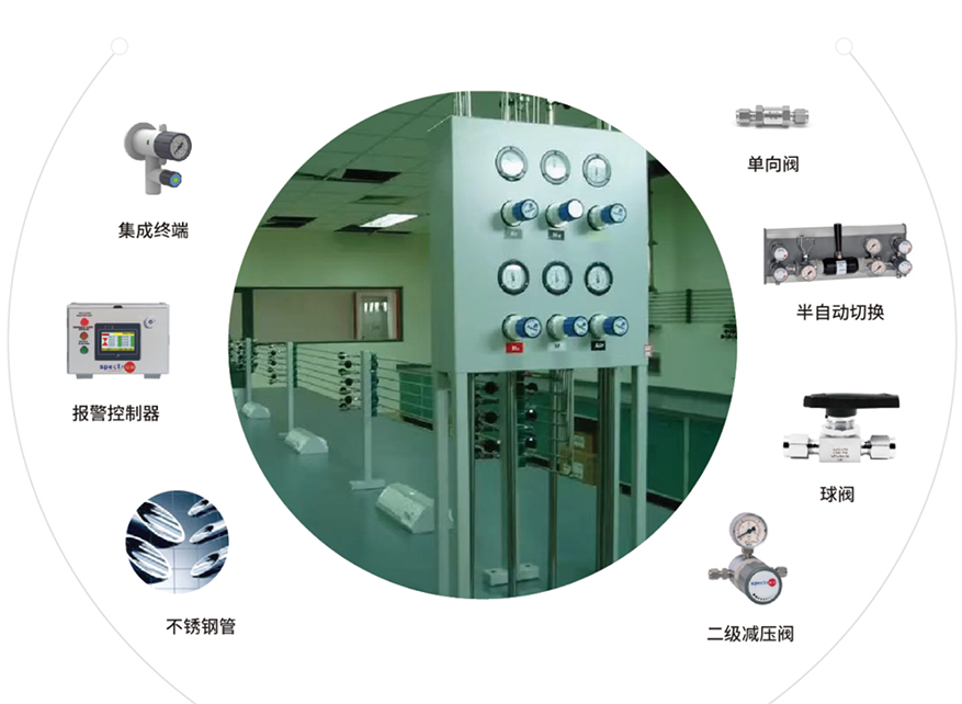 采用集中供氣形式,氣瓶室房間內(nèi)安裝泄露報警裝置并且連動緊急排風(fēng),避免危險發(fā)生